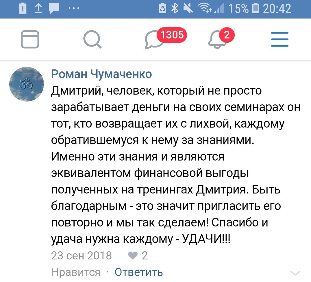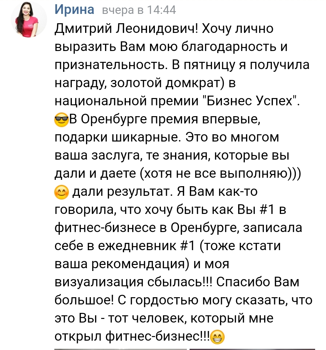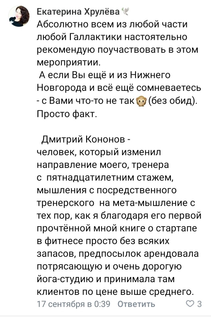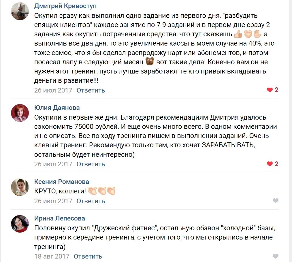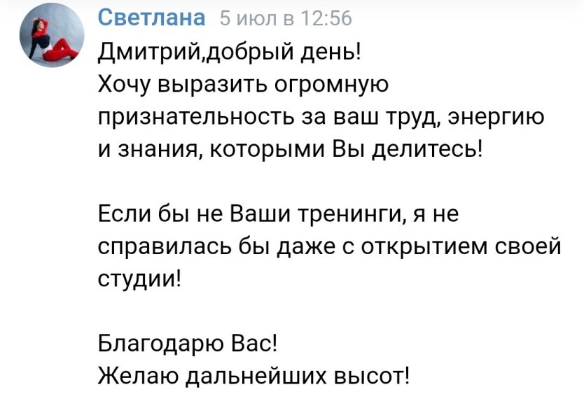 "Благодаря тренингу Дмитрия вывела свой клуб из глубокой ж..., в которой он находился 3 года из-за выхода на рынок большого конкурента"